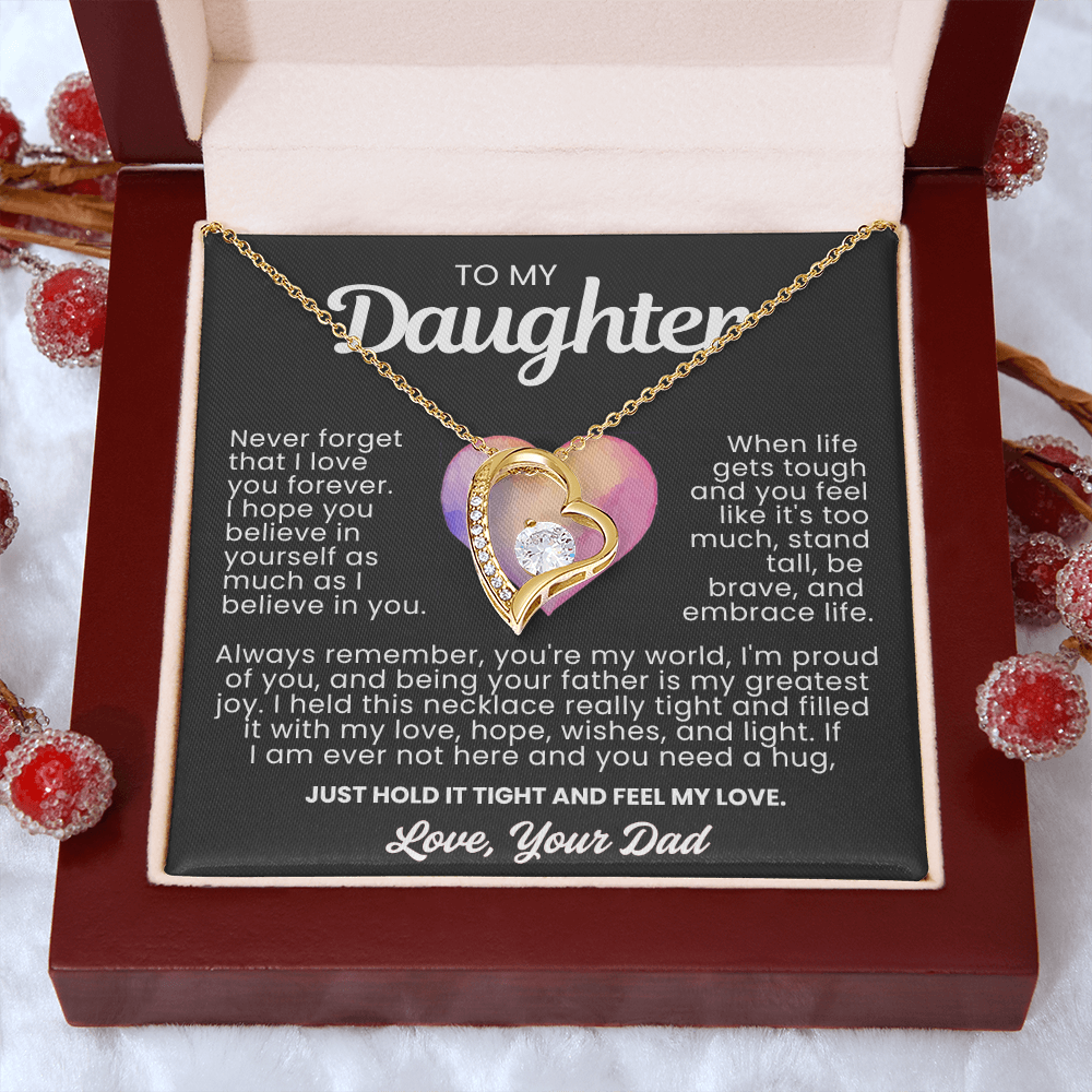 Never forget that I love you forever. I hope you believe in yourself as much as l believe in you. When life gets tough and you feel like it's too much, stand tall, be brave, and embrace life. Always remember, you're my world, I'm proud of you, and being your father is my greatest joy. I held this necklace really tight and filled it with my love, hope, wishes, and light. If I am ever not here and you need a hug, just hold it tight and feel my love.